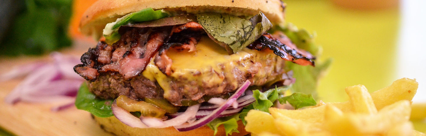 Steak de boeuf 135g, cheddar fondu, confit d'oignons, poitrine fumée, oignons frits et sauce BBQ maison